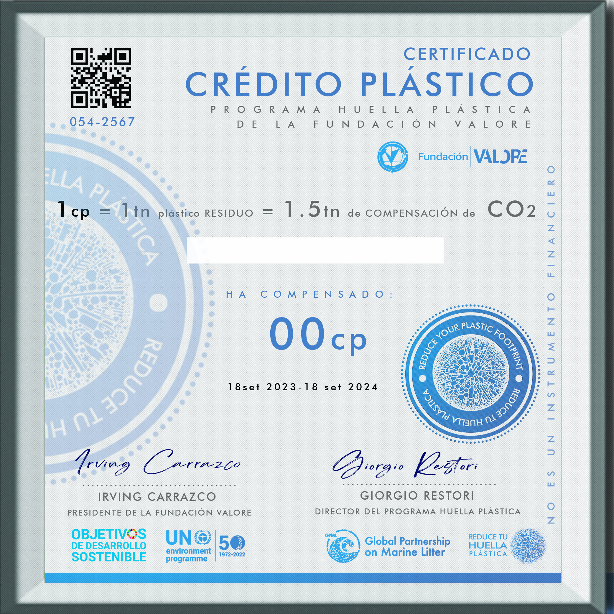 Los CréditoPlástico® son una herramienta ambiental que certifica que el titular ha sido responsable por generar, recolectar, reciclar y/o transformar el equivalente a 1 tonelada de desecho plástico. De esta forma, puede ser adquirido para compensar una huella de plástico.